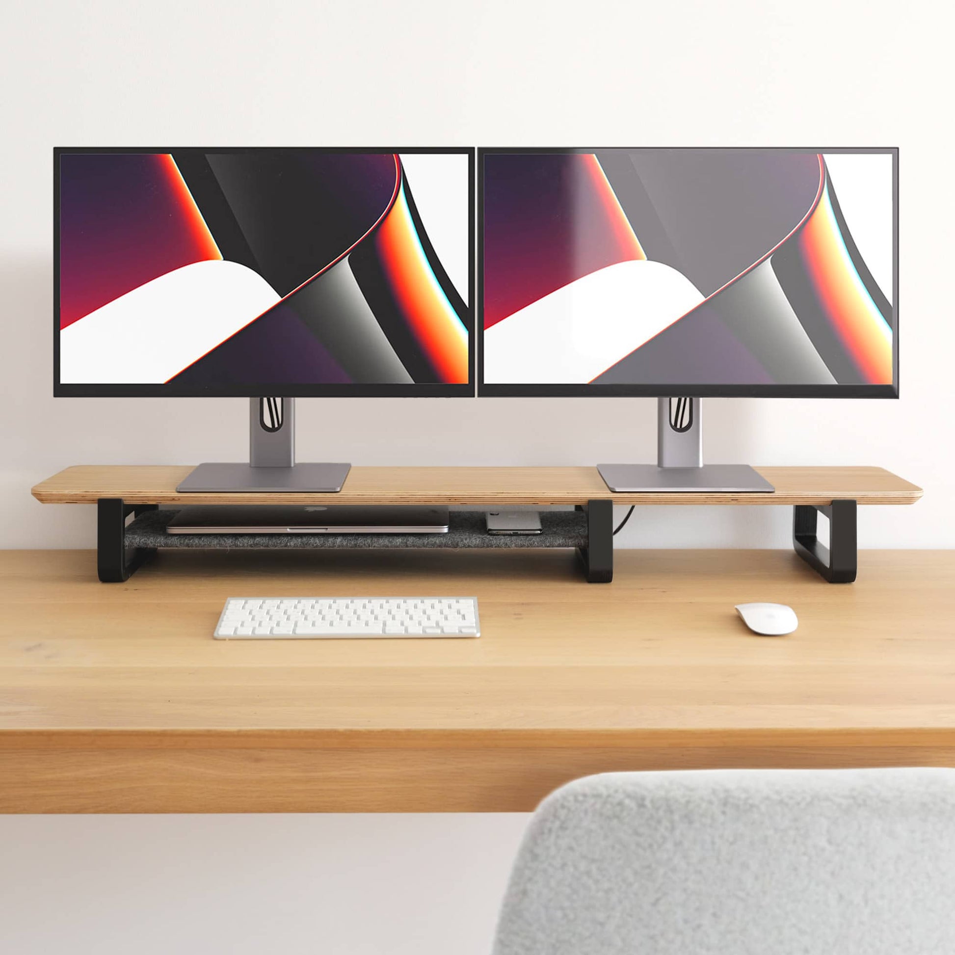 Bienvenido a nuestro sistema de soporte de monitores de primera calidad, la solución perfecta para elevar tu monitor y mejorar la ergonomía y el estilo de tu espacio de trabajo. Esta versión de gran tamaño puede alojar hasta dos monitores y ofrece mucho espacio debajo para que puedas mantener tu escritorio limpio y organizado.