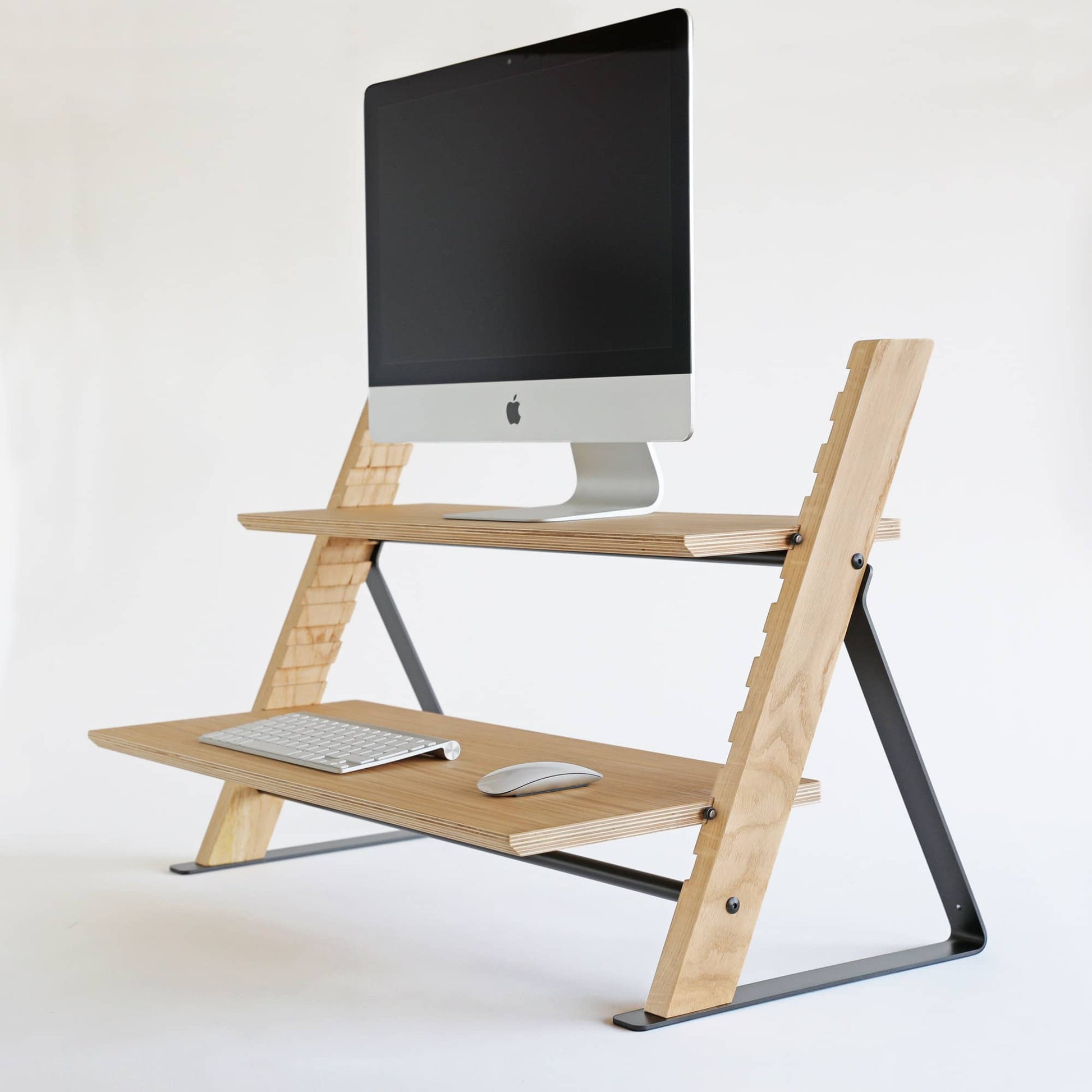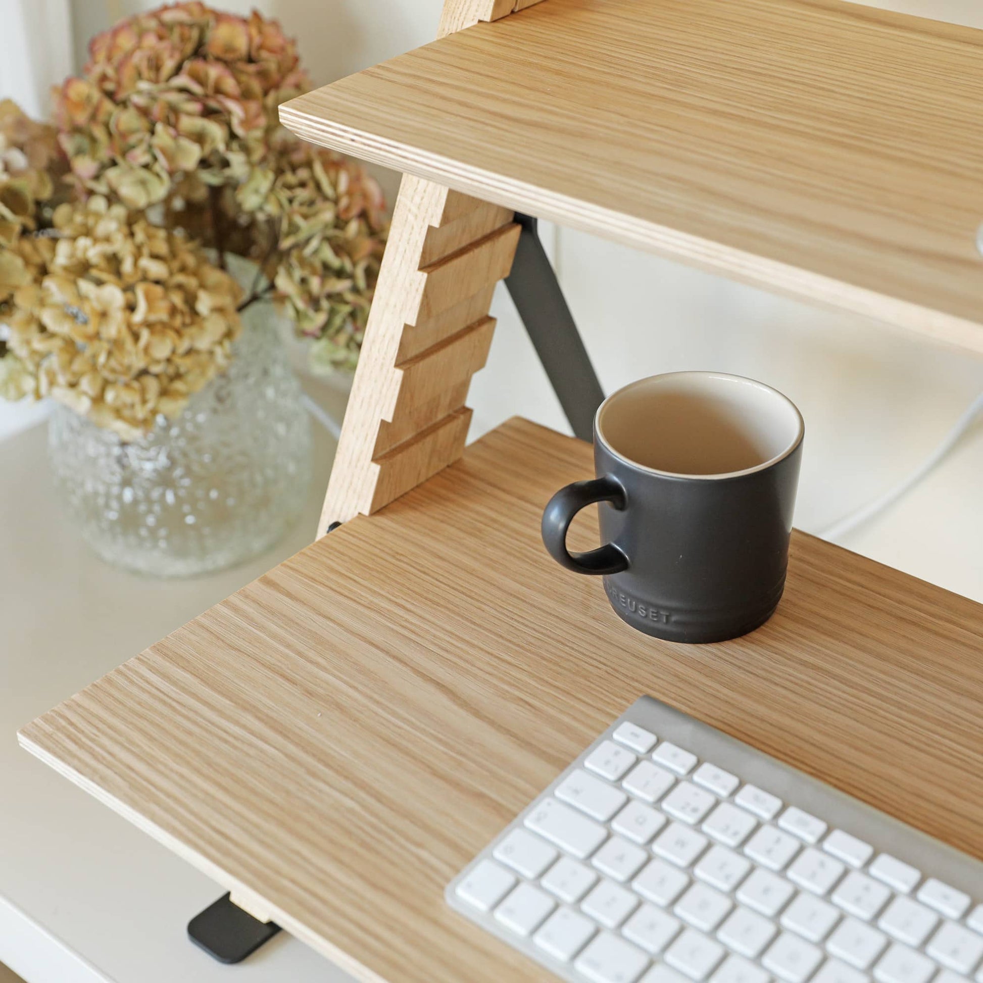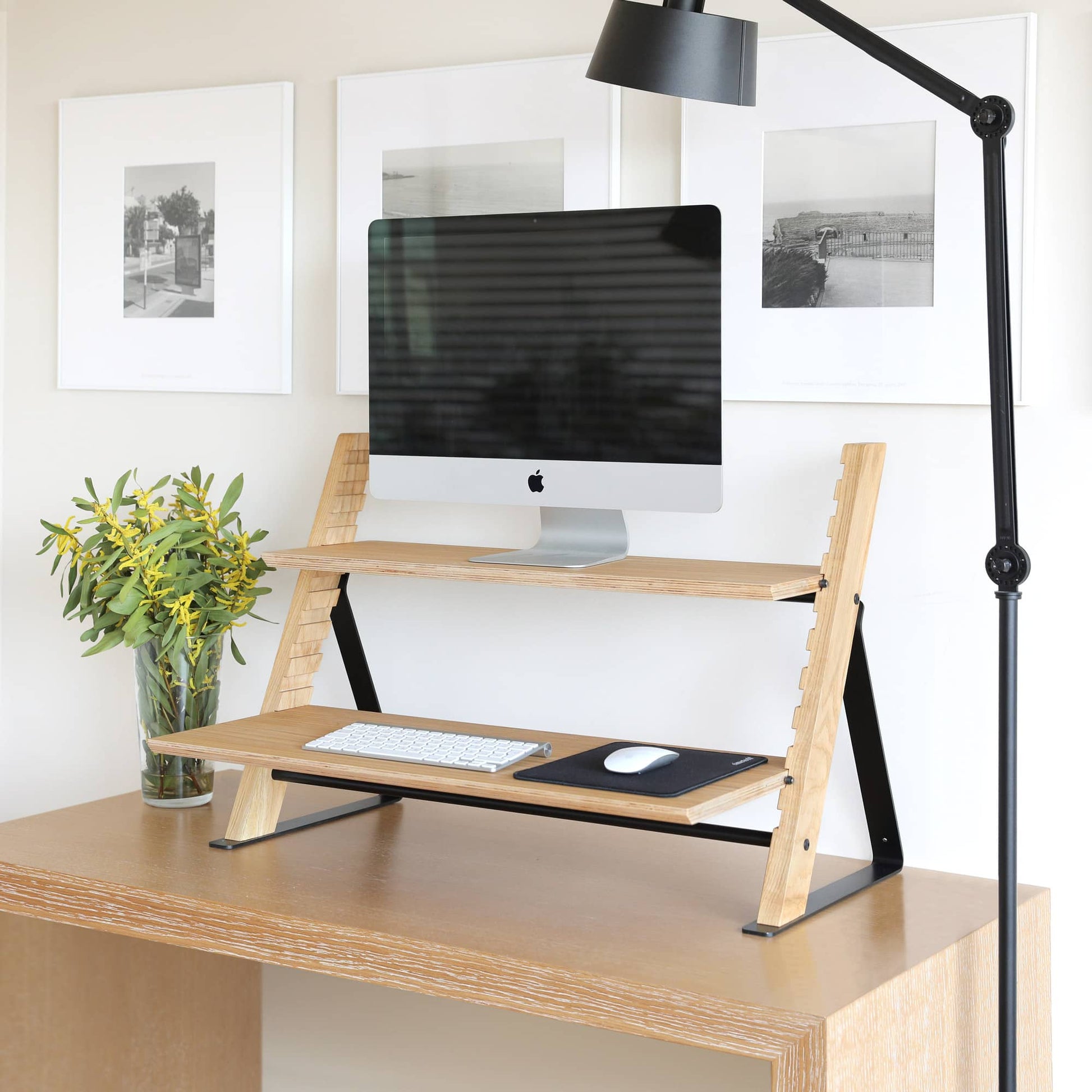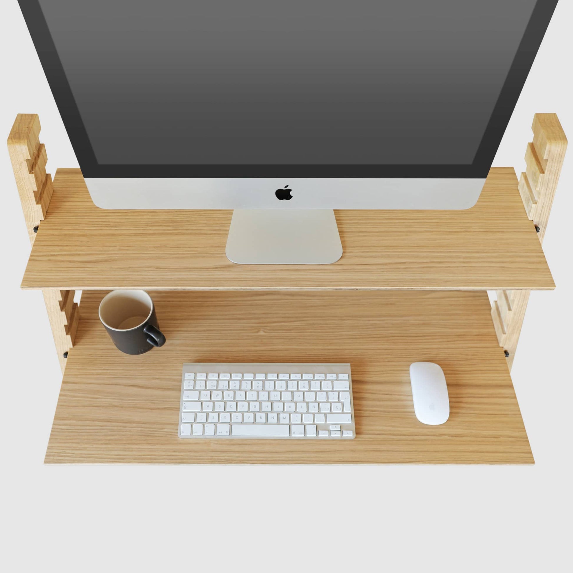 Presentamos el MISTATION - un convertidor de escritorio de pie que es la solución perfecta para transformar cualquier mesa en un escritorio de pie. Este soporte de madera de primera calidad da prioridad a la salud de tu espalda y cuello, fomentando una postura correcta mientras estás sentado o de pie. Es robusto, fabricado en acero, roble macizo y madera contrachapada chapada en roble, y ofrece un amplio espacio gracias a sus amplias bandejas. Su diseño minimalista se adapta a cualquier oficina o espacio doméstico.